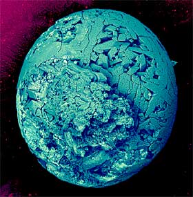 Dazu heißt es online: "Einem Bericht in den National Geographic News zufolge, hat Katherine Cagen von der Harvard University unlängst Anzeichen für einen Meteoriten-Impakt in Sedimenten entdeckt, die aus verschiedenen Stätten entlang des Hudson River entnommen wurden, der die Grenze zwischen New York City und New Jersey bildet. Zu den Evidenzen gehören deformierte Gesteine, seltene mikroskopisch kleine Nanodiamanten und mikroskopische, perfekt gerundete Steinchen, Spherulen (Abb. 5) genannt, welche sich in geschmolzenem Zustand formen, wenn das aufgeschmolzene und vaporisierte Gestein durch einen Impakt aus dem Weltraum in die Luft geschleudert wird und sich dann in dem temporären Vakuum verfestigt, das durch die Explosion erzeugt wird." [18]