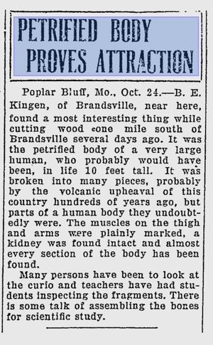 "Popular Bluff, Montag, 24. Oktober - B.E. Kingen aus Brandsville, hier in der Nähe, fand ein höchst interessante Ding, während er vor einigen Jahren eine Meile südlich von Brandsville Holz schlug. Es war der versteinerte Körper eines sehr großen Menschen, der vermutlich zu Lebzeiten eine Körpergröße von zehn Fuß [ca. 3.05 m; d.Ü.] hatte. Er war in viele Teile zerbrochen, wahrscheinlich aufgrund der vulkanischen Anhebung dieses Landes vor hunderten von Jahren, aber es waren zweifelsohne Teile eines menschlichen Körpers. Die Muskeln an Oberschenkeln und Armen zeichneten sich deutlich ab, es fand sich eine intakte Niere und alle Körperteile wurden gefunden.