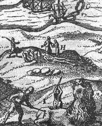 Es ist also mit ziemlicher Sicherheit davon auszugehen, dass es sich bei den - im 1619 in Leiden erschienenen "Oost ende West-Indische spiegel..." [4] von Joris van Spilbergen (Abb. 2) - abgebildeten - Seeleuten um Angehörige der Mannschaft von Kapitän Schouten waren. Sollten dessen Schiffstagebücher noch existieren, wäre es von allergrößtem Interesse, darin nach Notizen über dieses Ereignis zu suchen.