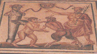 | + | [[Bild:Silenen.jpg|thumb|340x340px|'''Abb. 1''' Der Wettstreit zwischen Eros und Pan. Hermes schaut als Zeuge zu, und Silenus (rechts) ist als Schiedsrichter anwesend.]] | ||