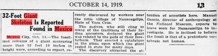 "Mexico City, 14. Oktober - Die fossilierten Überreste eines Riesen, der in der Größe mehr als 32 Fuß und 10 Inches [ca. 10 m; d.Ü.] misst, wurden kürzlich, einem Bericht zufolge, von Arbeitern in der Nähe des kleinen Dorfes Nanacamilpa im Staat Vera Cruz entdeckt.