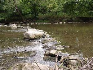 Ein großer Teil der östlichen Bank ist kürzlich zum Zwecke der Ziegel-Brennerei weg gegraben worden und es heißt, dass Holzkohle gefunden wurde, die über die Lehm-Masse verteilt ist, aus welcher die Aufschüttung besteht. Auf der Seite des Baches, nicht weit davon, waren Schotter-Bänke, die große Mengen menschlicher Knochen enthielten, welche [in der Größenordnung] von Wagen-Ladungen fortgeschafft wurden, wie es heißt. Viele dieser Skelette waren groß, aber die Knochen waren stark verrottet und zerkrümelten, wenn man sie in Unordnung brachte und der Luft aussetzte." [13]