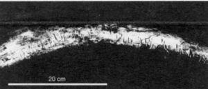 Abb. 1 Die Kerben auf dem Mammut-Knochen von Mamontovaya Kurya wurden durch scharfe Steinwerkzeuge verursacht, doch zu welchem Zweck? War vor 40 000 Jahren eine primitive Zeichenschrift in Gebrauch?