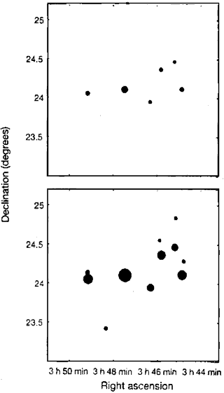 Die entscheidenden Beobachtungen wurden zwischen dem 13. und 24. Juni gemacht, wenn die Plejaden kurz vor Sonnenaufgang über dem nordöstlichen Horizont hell erstrahlen. Bei diesem niedrigen Winkel hat das Vorhandensein subvisueller Zirruswolken eine offensichtliche Auswirkung auf die Helligkeit der Sterne in dem Cluster, wie in der Abbildung (Abb. 1) gezeigt. Einige der kleineren Sterne scheinen vollständig zu verschwinden. Der Sichtbarkeitseffekt selbst ist eher subtil. Es ist bemerkenswert genug, dass er überhaupt von den alten Völkern bemerkt wurde, noch mehr aber, dass diese eine undeutliche Verbindung zum zukünftigen Wetter herstellten. [3] [...]