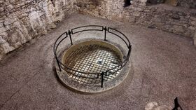 A view of the approximately 45-meter-deep well shaft, which was once built in the old Grimmenstein Castle to supply water to mining specialists, including those from Schneeberg/Saxony. A true marvel of hydraulic engineering.Blick in die wieder in Stand gesetzte Zisterne. Sie wurde von Herrn Hopf in alten Plänen wiederentdeckt. Ihre Rekonstruktion diente vor allem dem Brandschutz, da moderne Löschsysteme nicht ausreichen würden, um in einem Brandfall auf dem Schloss ausreichend Wasser in Kürze zur Verfügung zu stellen. Im Mittelalter diente die Zisterne als Wasserlieferant für die angeschlossene Brauerei und für den Fall das das Brunnenhaus bei Beschuss beschädigt worden wäre. 70.000 l Wasser wurden über ein System von Rohren einst in den Untergrund geleitet. //