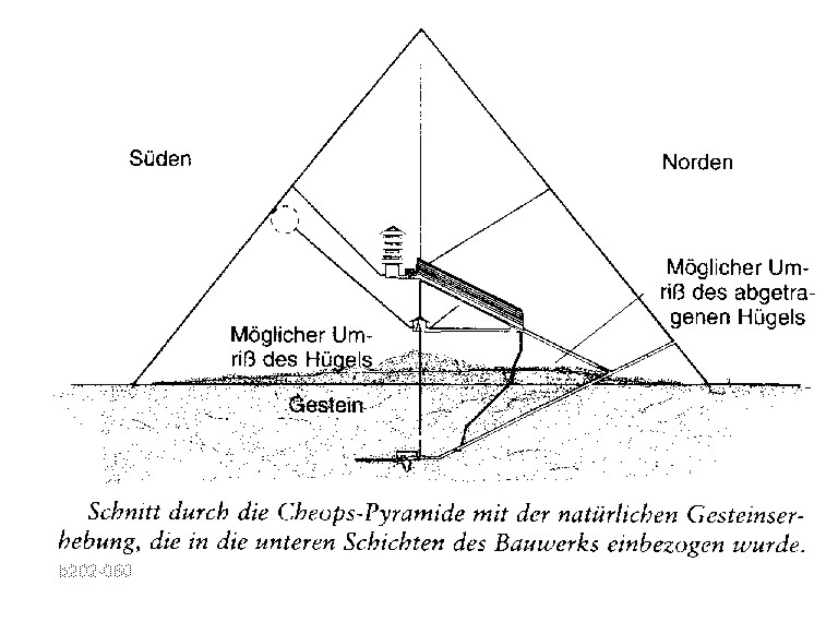 Schnitt durch die Cheops-Pyramide mit der natürlichen Gesteinserhebung, die in die unteren Schichten des Baumwerks einbezogen wurden.