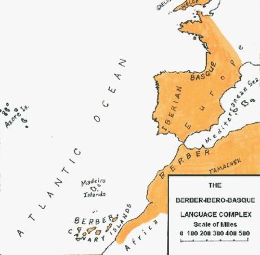 (bb) Die meisten Forscher schreiben den Guanchen nach wie vor eine vorwiegende Verwandtschaft mit den nordafrikanischen Ur-Berbern und den Basken in Südwesteuropa zu, eine Gemeinschaft, die man in Anlehnung an den Alternativ-Historiker und Atlantis-Experten R. Cedric Leonard als 'berber-ibero-baskischen Sprach- und Kulturraum' (Abb. 1) definieren könnte. (Wir möchten aufgrund unserer diesbezüglichen Übereinstimmung mit Leonard annehmen, dass die Kommunikation zwischen Spaniern und Guanchen zunächst gar nicht so schwierig gestaltet haben dürfte - sofern sich auch baskische Seeleute [1] auf den Schiffen der Eroberer befanden: möglicher Weise verstand man sich untereinander noch recht gut.) [2]