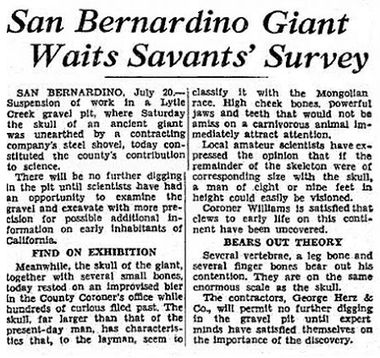 Und damit kommen wir wieder zurück zu den urtümlichen 'Kaliforniern mit Übergröße', genauer gesagt zu einem echten Prachtexemplar, nämlich dem so genanten San Bernardino Giant, dessen sterbliche Überreste 1936 bei eben jener Stadt San Bernardino (Abb. 5) entdeckt wurden, der er seinen Namen verdankt. Über diesen Fund brachte damals die Los Angeles Times einen recht ausführlichen Bericht (Abb. 4), dessen Übersetzung wir nachfolgend vorstellen.