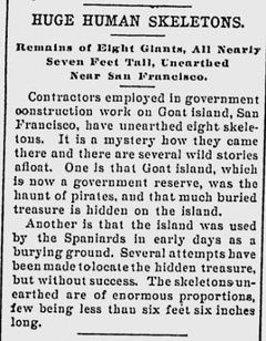 "Bauunternehmer, die auf Goat Island, San Francisco, für die Konstruktions-Arbeiten der Regierung eingesetzt sind, haben scht Skelette exhumiert. Es ist ein Rätsel, wie sie dorthin kamen, und es sind verschiedene wilde Strories dazu in Umlauf. Eine ist, dass Goat Island, das jetzt Regierungsbesitz ist, ein häufig von Piraten besuchter Ort war, und dass viele vergrabene Schätze auf der Insel verborgen sind.