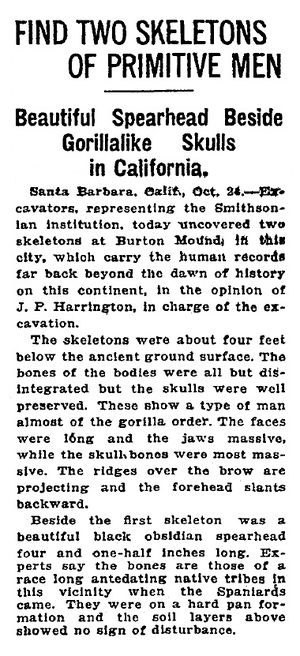Dr. Harrington, der mehrere Monate lang die Leitung der archäologischen Arbeiten der Smithsonian Institution im südlichen Kalifornien innehatte, ist sicher, dass in den jüngsten Tagen definitiv der Nachweis für ein neues Glied in der anthropologischen Kette erbracht wurde. Die weitere Untersuchung der gorillaähnlichen Schädel, die am Burton Mound ausgegraben wurden, hat, wie er erklärte, definitiv bewiesen, dass der Mensch von Santa Barbara während einer Periode existierte, die weit früher lag als die Ära des Neanderthal-Menschen. Nicht nur das, sondern er besaß eine Kultur, welche jene des Neanderthalers weit übertraf. [...]