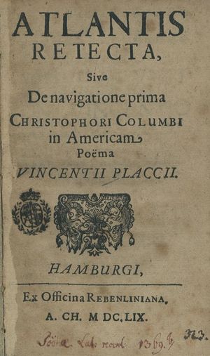 - ↑ Siehe: Vincent Placcius, "Atlantis Retecta, Sive De navigatione prima Christophori Columbi in Americam, Hamburg, 1659 (digitalisiert und online gestellt durch die: Sächsische Landesbibliothek – Staats- und Universitätsbibliothek Dresden (SLUB) / TU Dresden; Links abgerufen: 20.09.2013)