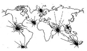 Nun, der in die Zeit des Unterganges passende Großimpakt auf der Erde ist heute nachgewiesen. Der in sieben Fragmente zerbrochene mächtige Kometenkörper schlug weit gestreut in verschiedenen Ozeanen der Erde ein. (Abb. 3) Wenn wir zunächst den gerade unter diesen Umständen zwar durchaus möglichen, aber durch geologische Fakten oder Indizien bisher noch nicht beweisbaren Fall eines Einschlages auf Atlantis selbst beiseite lassen, so ist der Untergang dieser Insel unter den gegebenen Impaktbedingungen noch immer durchaus einleuchtend: Atlantis lag an einer der verwundbarsten Stellen in der labilsten, größten Nahtstelle der Erde, der mittelozeanischen Grabenbruch-Riftzone.