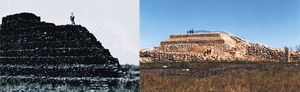 Wir möchten dem hinzufügen, dass wir bei unseren Recherchen für diesen Beitrag im Internet zumindest auf die Fotographie einer s c h e i n b a r annähernd quadratischen Teneriffa-Pyramide gestoßen sind (Abb. 2, links), die durchaus Ähnlichkeiten mit der bekannten Stufenpyramide aufweist, welche Pharao Djoser (III. Dynastie) erbauen ließ (Abb. 2, rechts). Interessanter Weise befindet sich die zuletzt genannte, pharaonische Pyramide - wie Adjibs Bauwerk - in Saqqara! Ein weiteres Indiz für eine frühe, kanarisch-ägyptische Connection?