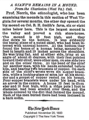 Von der Entdeckung eines bescheideneren Exemplars ist in der Ausgabe der New York Times vom 20. Nov. 1883 die Rede. In diesem Bericht mit dem Titel "A GIAN'S REMAINS IN A MOUND" (Abb. 5) (Überreste eines Riesen in einem Mound), der, wie es dort heißt, von der Zeitschrift CHARLESTON CALL aus West Virginia übernommen wurde, heißt es: "Prof. Norris, der Ethnologe, der die Mounds in diesem Abschnitt West Virginias mehrere Monate lang untersucht hat, öffnete kürzlich den großen Mound auf Col. B.H. Smiths Farm, sechs oder acht Meilen unterhalb von hier. Dies ist der größte Mound im Tal und er erwies sich als reichaltige Fundstätte. Der Mound ist 50 Fuß hoch, und sie gruben sich bis zum Grund hindurch. Er war offensichtlich die Grabstätte eines berühmten Häuptlings, der mit außergewöhnlichen Ehren bestattet wurde.