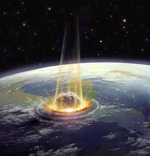 | − | [[Bild:Spedicato 2.jpg|thumb|'''Abb. 2''' Vor ca. 65 Millionen Jahren schlug im heutigen Golf von Yucatan vermutlich ein extraterrestrisches Objekt von enormer Größe ein. Dieser "Alvarez-Impakt" dürfte das gewaltige Artensterben ausgelöst haben, dem auch die Saurier zum Opfer fielen.]]
