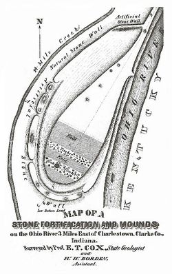 | − | [[Bild:Fort mounds.jpg|thumb|'''Abb. 1''' ''Edward Travers Cox''´ Skizze einer großen, befestigten Anlage der Moundbauer am Ohio River im Staat Indiana]] | + | [[Bild:Fort mounds.jpg|thumb|250px|'''Abb. 1''' ''Edward Travers Cox''´ Skizze einer großen, befestigten Anlage der Moundbauer am Ohio River im Staat Indiana]] |