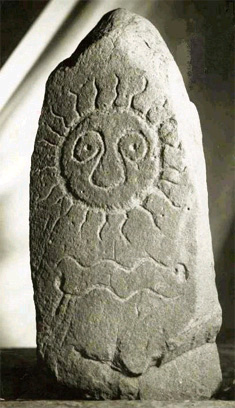 - Abschließend soll hier noch ein Artefakt vorgestellt werden, das 1973 ebenfalls in Queensland entdeckt wurde. Es ist weder aboriginal, noch ägyptischen oder phönizischen Ursprungs, und wurde lange vor der Besiedelung Australiens durch Weiße graviert. Die Symbole auf diesem Sonnenstein (Abb. 22) weisen jedoch große Ähnlichkeit mit denen der Latolita-Kultur Equadors auf, die vor etwa 3000 Jahren existierte. Das Idol könnte eine einfache Vorform der weißbärtigen Andengottheit Viracocha darstellen. Der mesoamerikanische Viracocha hält z.B auf vielen Darstellungen zwei Schlangenstäbe in Händen und hat 23 doppelte Wellenlinien um seinen Kopf, während sein australischer Vetter 23 einfache Wellenlinien aufweist - und beide haben Tränen im Auge.
