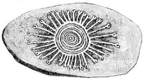 - Unter den heiligen Tjuringa-Steinen der Kimberley-Region findet sich auch ein Sonnensymbol, das dem Aton-Zeichen entspricht. (Abb. 18) Diese Sonnengottheit wurde in Ägypten um 1400 v. Chr. verehrt. Nach atonistischem Kunstverständnis wurde die Sonne mit kleinen Händen dargestellt, die sich nach den Menschen ausstrecken, um sie zu berühren.