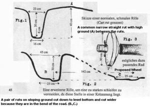 Die Spuren sind eine sehr interessante Art von Rillen, sie über die Jahre nicht an allen Stellen abgenutzt worden. Die Basis einer solchen Rille ist ca. 6 cm breit, manchmal etwas weiter. An Biegungen, wo die Rillen etwas breites sind, ist trotzdem nur eine ca. 12 cm breite, etwas tiefere Spur zu finden (siehe auch Abb. 1). Aus dem ganzen läßt sich schließen, daß die Spuren von ca. 5 cm breiten Steinrädern stammen. Wären die Räder aus Holz gewesen, hätten sie die Rillen nicht weiter vertiefen können.