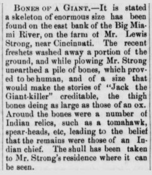 "Wie es heißt, ist ein Skelett von enormer Größe am Ostufer des Big Miami River gefunden worden, [und zwar] auf der Farm von Mr. Lewis Strong, nahe bei Cincinnati. Die kürzlichen Hochwasser wuschen einen Teil des Bodens weg, und während Mr. Strong pflügte, legte er einen Haufen von Knocchen frei, die sich als menschlich herausstellten und von einer Größe [sind], welche die Geschichten um >Jack and the Giant-Killer< glabwürdig macht, [denn] die Oberschenkel-Knochen sind so groß wie jene eines Ochsen. Um die Knochen herum wurde eine Anzahl indianischer Relikte gfunden, wie etwa ein Tomahawk, Speer-Spitzen etc., was zu der Meinung geführt hat, das die sterblichen Überreste diehenigen eines Indianer-Häuptlings sind. Der Schädel ist zu Mr. Strongs Wohnsitz gebracht worden, wo er besichtigt werden kann." [1]