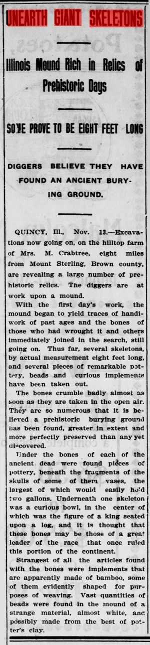 - ↑ Quelle: o.A., "UNEARTH GIANT SKELETONS - Illinois Mound Rich in Relics of Prehistoric Days - SOME PROVE TO BE EIGHT FEET LONG - DIGGERS BELIEVE THEY HAVE FOUND AN ANCIENT BUTYING GROUND", in: The Evening Statesman, 13. November 1906, S. 6; nach: CHRONICLING AMERICA -Historic American Newspapers, unter: The Evening statesman., November 13, 1906, Page SIX, Image 6 (abgerufen: 16. Aug. 2014; Übersetzung ins Deutsche durch Atlantisforschung.de)
