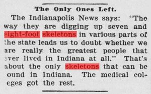 "Die Indianapolis News meint: >Die Art und Weise, wie man in verschiedenen Teilen des Staates sieben und acht Fuß [große] Skelette ausgräbt, führt uns zu Zweifeln daran, ob wir wirklich die größten Menschen sind, die jemals in Indiana gelebt haben.< Es geht um die einzigen [übrig gebliebenen] Skelette [dieser Art], die In Indiana gefunden werden können. Die medizinischen Hochschulen haben den Rest [die Überreste?; d.Ü.]." [8]
