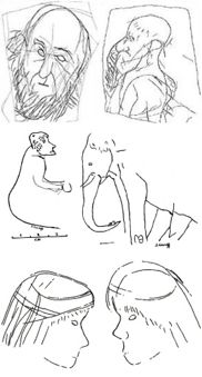 Abb. 2 Eine Auswahl von Nachzeichnungen der Magdalénier-Portraits, die in der Höhle von La Marche entdeckt wurden. Interessanterweise sind die meisten männlichen Personen glatt rasiert dargestellt. Die Portraits wirken zum Teil höchst realistisch, biswilen aber auch geradezu karikaturenhaft.