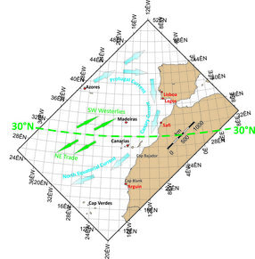 Den portugiesischen Seefahrern war schließlich die Wiederentdeckung eines speziellen Windsystems vergönnt, um von den Kanaren über den Umweg der Azoren wieder zurück ins Mittelmeer zu segeln. Sie nannten dieses Manöver „Volta do mar“ – Rückkehr übers Meer. Der navigatorische Trick bestand darin, von den Kanaren aus nicht in nördlicher, sondern in nordwestlicher Richtung tief in den Atlantik zu segeln. Dort, etwa 1.000 bis 1.500 km von der afrikanischen Küste entfernt, zwischen 28° – 30° nördlicher Breite, verhalten sich die Winde anders als unmittelbar vor der Küste Afrikas. Durch die Rossbreitenzone ausgelöst, wehen die Winde (engl. horse-latitude winds) als so genannte „SW Westerlies“ entgegen der Passatwinde in nordöstlicher Richtung nach Europa zurück [2]. Die ersten Navigatoren, die den Mut besaßen, soweit wie möglich in NW-Richtung in den Atlantik zu segeln, erreichten schließlich den aus Amerika kommenden Golfstrom, der sie via Azoren wieder zurück zum Eingang des Mittelmeeres brachte.