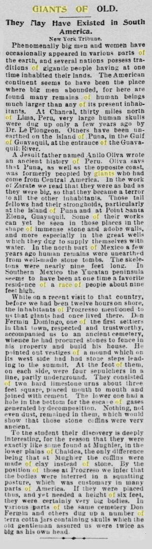 Ein Jesuitenpater namens Anelio Oliva schrieb eine Geschichte des Alten Peru. Oliva sagt, dass Puná, wie auch die gegenüber liegende Küste, vormals von Riesen bevölkert gewesen sei, die aus Mittelamerika gekommen waren. In dem Werk von Zárate lesen wir, sie seien ebenso böse gewesen wie sie groß waren, sodass sie zum Schrecken aller anderen Bewohner wurden. Jene hochgewachsenen Gesellen verfügten über Festungen, vor allem auf Puná und bei Point Santa Elena, Guayaquil. Einige ihrer Werke sind noch heute an jenen Orten in Form immenser Stein- und Lehmziegel-Wälle zu sehen, und insbesondere der großen Brunnen, welche sie gruben, um sich mit Wasser zu versorgen. Im nördlichen Teil von Mexiko wurden vor wenigen Jahren menschliche Überrreste aus wohlgebauten Stein-Grüften zutage gefördert. Die Skelette waren fast neun Fuß [ca. 2,74 m; d.Ü.] groß. Im südlichen Mexiko scheint die Halbinsel Yucatán einst die Lieblings-Residenz einer Rasse von Menschen gewesen zu sein, die ebenfalls etwa neun Fuß groß waren.