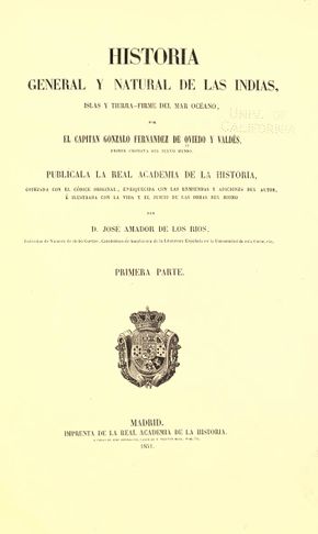 Der erste Teil dieses Werkes wurde 1535 unter dem Titel Historia general y natural de las Indias veröffentlicht. Eine zweite, überarbeitete Auflage erschien 1547 unter dem Titel Coronica de las Indias. La hystoria general de las Indias y con la Conquista del Perú. Gonzalo Fernández de Oviedo starb 1557 in Valladolid im Alter von 79 Jahren." [3]
