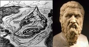 (1) Links: Skizze der zentralatlantischen Großinsel Atlantis, die dem mysteriösen Paul Schliemann zugeschrieben wird. Rechts: Platon (Bild-Archiv Atlantisforschung.de)
