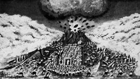 Unter anderem wird darin angeblich der Kataklysmus (Abb. 5) geschildert, der dieses mythische Land vernichtet haben soll: "Im 6. Jahre Kau, am 11. Muluk im Monat Zac, fanden schrecklich gehobene Erdbeben statt, die ohne Unterbrechung bis zum 13. Chuen andauerten, das Land von Mu war das Opfer; es wurde zwei mal emporgehoben, und plötzlich war es über Nacht verschwunden: das Meer wurde fortwährend durch vulkanische Gewalten aufgewühlt. [...] Unfähig, den gewaltigen Zuckungen gegenüber stand zu halten, versanken sie mit ihren 64 Millionen Einwohnern 8060 Jahre vor der Abfassung dieses Buches." [6]