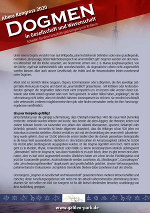 For this reason, the Galileo-Park again in cooperation with Dr. Dominique Görlitz organize the next ABORA congress "Dogmen in Gesellschaft und Wissenschaft" (Dogmas in Society and Science). They present several scientists, entrepreneurs and researchers whose research results do not correspond to the currently prevailing doctrinal opinion. Make yourself a picture. The congress is suitable for all critically thinking visitors, regardless of their education.