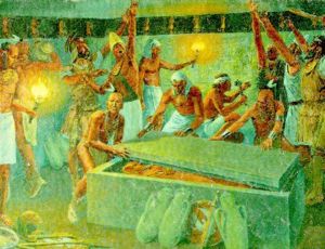 "Der Eingang war mit einem großen, steinernen Rad verschlossen, auf dem seltsame Schriftzeichen prankten. Burrows meisterte auch dieses Hindernis und trat schließlich in eine geräumige Kammer ein, in der - umringt von Waffen und Statuen - ein massiver Steinsarkopharg stand. Mit dem Brecheisen gelang es ihm, den Sargdeckel zu öffnen. Darin eingebettet lag ein zweiter Sarg aus purem Gold. Burrows öffnete auch diesen - und seine Augen weiteten sich: Vor ihm lag eine in Tücher eingehüllte Mumie..." [2]