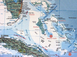 Das Zentrum dieses ehemaligen Landes sind die riesigen Bahama-Bänke in deren Zentrum sich die heutigen Inseln Andros, Exuma und Eleuthera befinden. Westlich von ihnen befindet sich die sogenannte Tongue of Ocean, ein Tiefwassergraben mit Wassertiefen um 8000 m, der in seinem südlichen Teil in zwei ovale Löcher von 90 und 110 Kilometern Durchmesser und 1200 und 2400 m Tiefe mündet, die möglicherweise die Einschlagskrater des Asteroiden darstellen (Abb. 6).