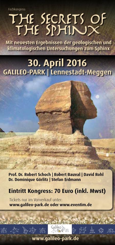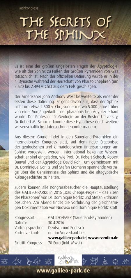 (dg / bb) Anlässlich der aktuellen Sonderausstellung „Das Eisen der Pharaonen“ findet am 30. April 2016 im Galileo-Park, Lennestadt, der internationale Kongress „The Secrets of the Sphinx“ statt. Namhafte Wissenschaftler und Forscher aus dem In- und Ausland halten Vorträge über das mögliche Alter des großen Sphinx von Gizeh sowie der möglichen Existenz prähistorischer, bisher unbekannter Hochkulturen auf der Welt.