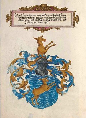Zunächst aber war es der Stamm des Andreas, der durch geschäftlichen Erfolg beeindruckte und dessen Mitglieder zu hohem Ansehen gelangten. Als die vier Söhne des Andreas schließlich Stoffe für die Kleider des Kaisers lieferten und somit quasi kaiserliche Hoflieferanten wurden, drückte sich die herausragende Stellung der Familie auch für alle sichtbar aus. Im Jahre 1462 verlieh Kaiser Friedrich III. den vier Söhnen des Andreas ein Familienwappen. (Abb. 2) Es zeigt ein goldenes, springendes Reh auf blauem Grunde und so hieß der ältere Familienstamm fortan „Fugger vom Reh“. Bereits zehn Jahre zuvor hatte man sich geschäftlich von dem jüngeren Stamm, der übrigens im Jahre 1473 ein Wappen mit einer Lilie verliehen bekam und seitdem „Fugger von der Lilie“ heißt, getrennt.