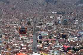 A new tourist highlight in La Paz is the cable car that circles the city. It connects the distant parts of the city, which are often at an altitude of 4,000 m. It's a real feast for the eyes to take a cable car tour through La Paz.Die Fahrt fast senkrecht nach El Alto. Künstler haben unmittelbar vor El Alto einen Häuserblock farbenfroh angestrichen. Für die Touristen natürlich das Fotomotiv!//