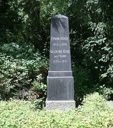Aus der am 8. August 1877 geschlossenen Ehe mit Valentine Framm (1859–1901) gingen vier Kinder hervor: Bertha (1878–1902), die spätere Ehefrau des Heidelberger Geographen Alfred Hettner, Erwin (jun.) (1881–1915), seit 1910 Privatdozent für Pharmakologie an der Universität Heidelberg, Anna (1885–1955) und der früh verstorbene Hans Adolph (1895–1896). Rohdes Ruhestätte befindet sich auf dem Heidelberger Bergfriedhof (Abteilung N). Sein Grabmal (Abb. 2) ist ein Obelisk aus schwarzem, polierten Granit; die Inschrift nennt seinen Namen und den seiner Frau." [1]
