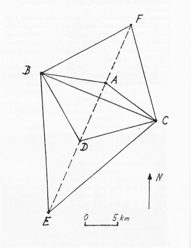 Die mittlere relative Abweichung beträgt 0,576 % bei Seitenlängen von 1045 m bis 1966 m. Bemerkenswert sind weiterhin die 5 nahezu gleichlangen Abstände ("Unterirdische Gänge") AB, AD, AE, BC, BD mit Seitenlängen von 1045 m bis 1050 m.