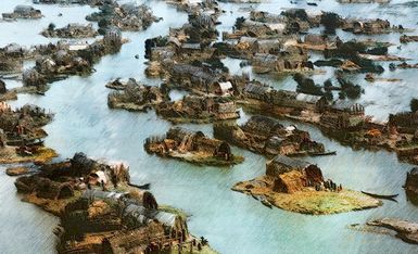 Abb. 1 Eine Siedlung 'schwimmender Inseln' der Ma'dan in den Sümpfen des südlichen Irak vor der von Saddam Hussein erzwungenen Trockenlegung des Gebiets. (Foto: Thor Heyerdahl)