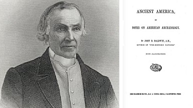 "Im Jahr 1871 veröffentlichte er", wie Tony O’Connell bemerkt, ">Ancient America< [1], worin er die Ursprünge der frühesten Völker in Amerika diskutiert. In diese Diskussion schließt er auch eine Besprechung der Theorie von Brasseur de Bourbourg ein, welcher der Ansicht war, Atlantis sei eine große Landmasse in Atlantik gewesen, deren Bewohner nach Nord- uns Südamerika flüchteten und unter vielen Namen, wie z.B. Maya, bekannt wurden. Baldwin betrachtete de Bourbourgs Theorie eindeutig als unbewiesen." [2] Was die Moundbauer betrifft, so votierte Baldwin, der 1867 als Mitglied in die American Antiquarian Society aufgenommen worden war [3], dafür, dass ihre Vorfahren aus Asien nach Amerika gekommen seien, aber einer anderen Rasse entstammten als die Indianer. [4]