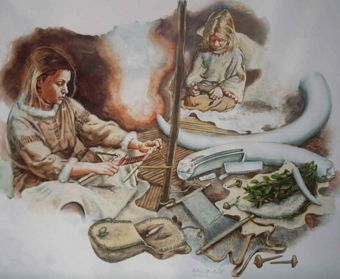 Abb. 5 Links im Bild: Eine Weberin des Gravettien bei der Arbeit. (Gemälde von Libor Balák ©)