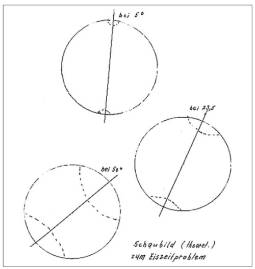 Für die hier zur Diskussion stehende „Eiszeitproblematik” bliebe festzuhalten, dass vor etwa 12.000 Jahren unter einem gewaltigen Kataklysmus die Neigung der Erdachse entschieden verändert worden ist. Nach meinen Überlegungen war sie zur Zeit der „Neandertaler-Vereisung”, also vor 12.000 Jahren etwa 50 ° gegen den Pol der Ekliptik geneigt. So gab es jene großen polaren Vereisungsräume und die riesigen Inlandgletscher. Dann wurde sie im Verlauf einer kosmisch bedingten Katastrophe um nahezu 50 ° aufgerichtet. Nun stand die Erdachse fast senkrecht zur Ekliptik (etwa 5 °).