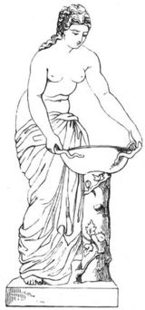 Es ist sehr begreiflich, dass die Nymphen als Personifikationen jeder Naturschönheit zu den anmutigsten Kunstdarstellungen Veranlassung gaben. Wir geben zwei derselben in Nachbildungen wieder: die erste (Abb. 1) zeigt die Statue einer Nymphe, gefunden in Praeneste; die andere (Abb. 2), nach einem Basrelief, drei halbnackte Nymphen, welche Muscheln halten, an den Seiten die Dioskuren; unten ruht ein Flussgott mit einem Ruder.