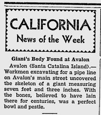 "Avalon, Santa Catalina Island - Arbeiter, die Ausschachtungen für eine Roheleitung auf der Hauptstraße von Avalon vornahmen, legten das Skelett eines Riesen frei, der sieben Fuß und drei Inches [ca. 2,21 m; d.Ü.] misst. Bei den Knochen, welche, wie man annimmt, Jahrhunderte lang dort gelegen haben, befanden sich eine makellose Schale und ein Stößel." [6]