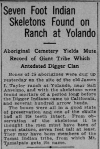 "Die Knochen von 25 Eingeborenen wurden gestern auf dem Land der alten James J. Taylor Ranch bei Yolando in der Nähe von San Anselmo ausgegraben, und zusammen mit den Skeletten wurden Mörser aus einer Periode gefunden, lange bevor die Digger-Indianer nach Kalifornien kamen, sowie mehrere hundert Pfeilspitzen.