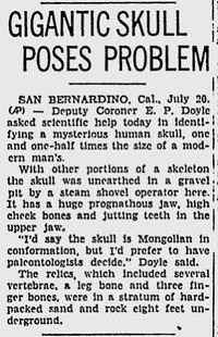 Anmerkung II: Überreste eines weiteres Exemplars der 'archaischen' Uramerikaner wurden offenbar ein Jahr später (1924) in Kalifornien entdeckt. Siehe: o.A., "UNEARTH SKULL OF ANCIENT RACE - California Fossil Said to Antedate Earliest Known in Europe", in: The Spokesman-Review, 25. März 1924 (Quelle). Diese Entdeckung wurde später augenscheinlich vom anthropologischen Establishment - ebenso wie jene des Santa Barbara Man - sehr gründlich unter den sprichwörtlichen 'Teppich gekehrt' und diese Funde gerieten fast völlig in Vergessenheit! - ↑ Quelle: o.A., "SAN BERNARDINO GIANT WAITS SAVANTS´ SURVAY", in: Los Angeles Times, 21. Juli 1936; nach: Micah Ewers, Archiv 4 (Übersetzung ins Deutsche durch Atlantisforschung.de)