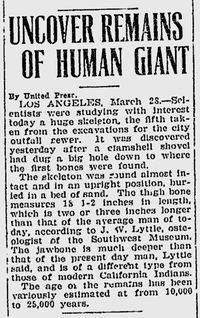 "Los Angeles, 8. Juli - Vierzehn Skelette riesenhafter Indianer, die vermutlich vor Jahrhunderten in diesem Gebiet umherzogen, sind gerade aus dem Sand des Strandes der Malibu Ranch, direkt im Norden von Santa Monica, ausgegraben worden. Das kleinste Skelett indiziert eine Statur von sieben Fuß [ca. 2,13 m; d.Ü.] Größe, während mehrere der Indianer mindestens acht Fuß [ca. 2,44 m; d.Ü.] groß gewesen sein müssen.