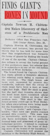"Captain Newton H. Chittenden, der Forschungsreisende und Vortragsredner, hat die von ihm bereits seit einiger Zeit vertretene Theorie, dass diese Gegend vormals die Heimat von Riesen war, durch den Fund von Knochen eines [Exemplars] dieser Spezies bewiesen. Captain Chittenden lehnt es ab, die Grabstätte dieses prähistorischen Menschen anzugeben, doch er räumt ein, dass sie sich irgendwo in einem der alten indianischen Mounds von West Berkeley befindet.